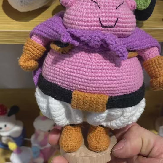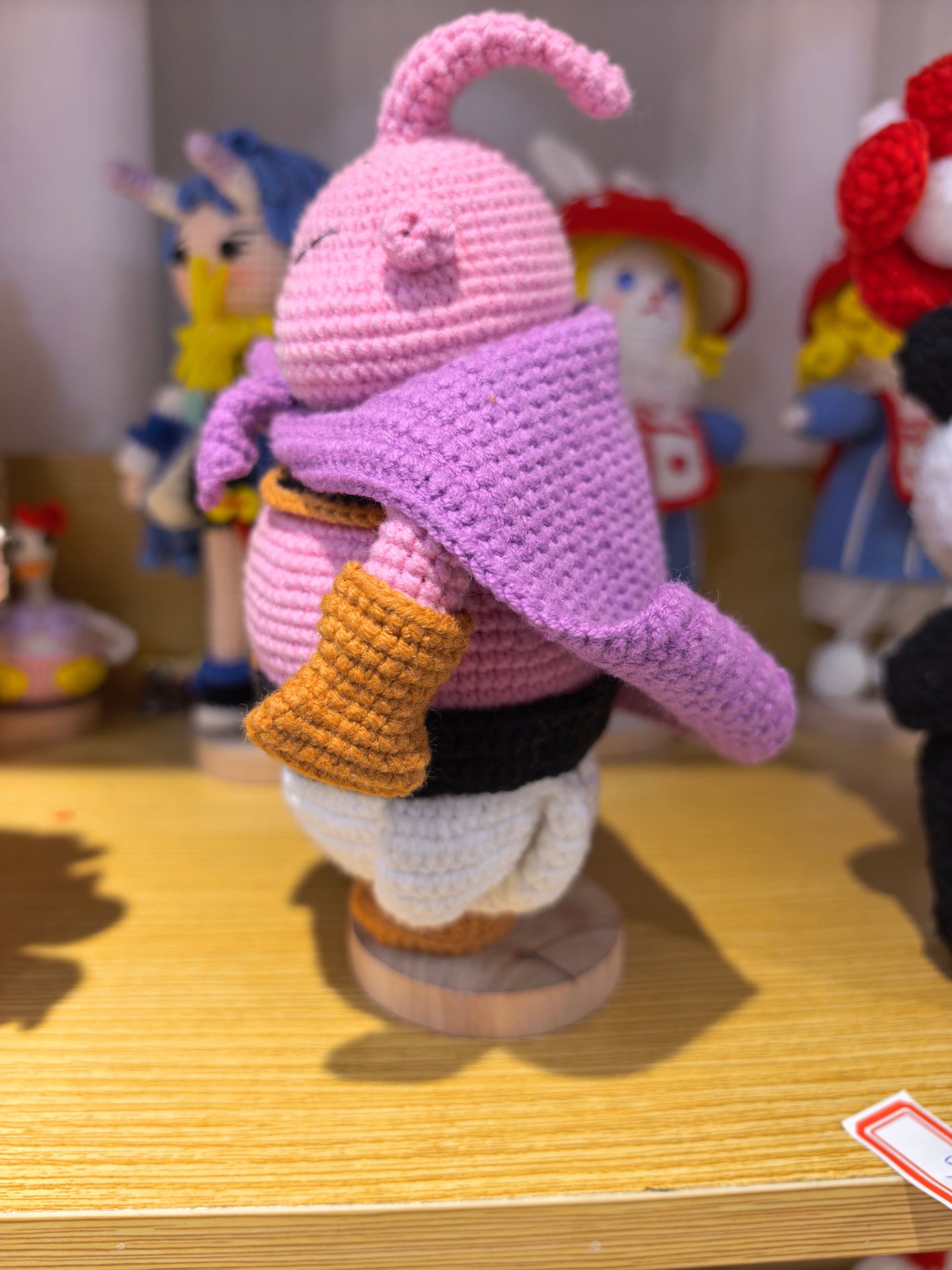 This handmade crocheted Fat Buu wraps the gluttonous yet tsundere pink puff from Dragon Ball into warm, cozy yarn: the round, chubby belly is soft enough to leave a little imprint when squeezed, the mischievous, squinting smile perfectly hits childhood memories, and the details like the purple cape and black belt are spot on—even the little tuft on top of the head is a handmade, cute little touch.