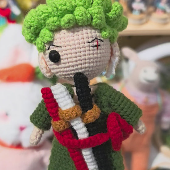 Description: Hand-crocheted One Piece Zoro character doll, featuring his signature short green hair with a green robe and red sash, holding three swords with exquisite details. Made from high-quality yarn, the three-dimensional design vividly recreates the anime character. It stands steadily, making it an ideal choice for anime fans to collect or gift.