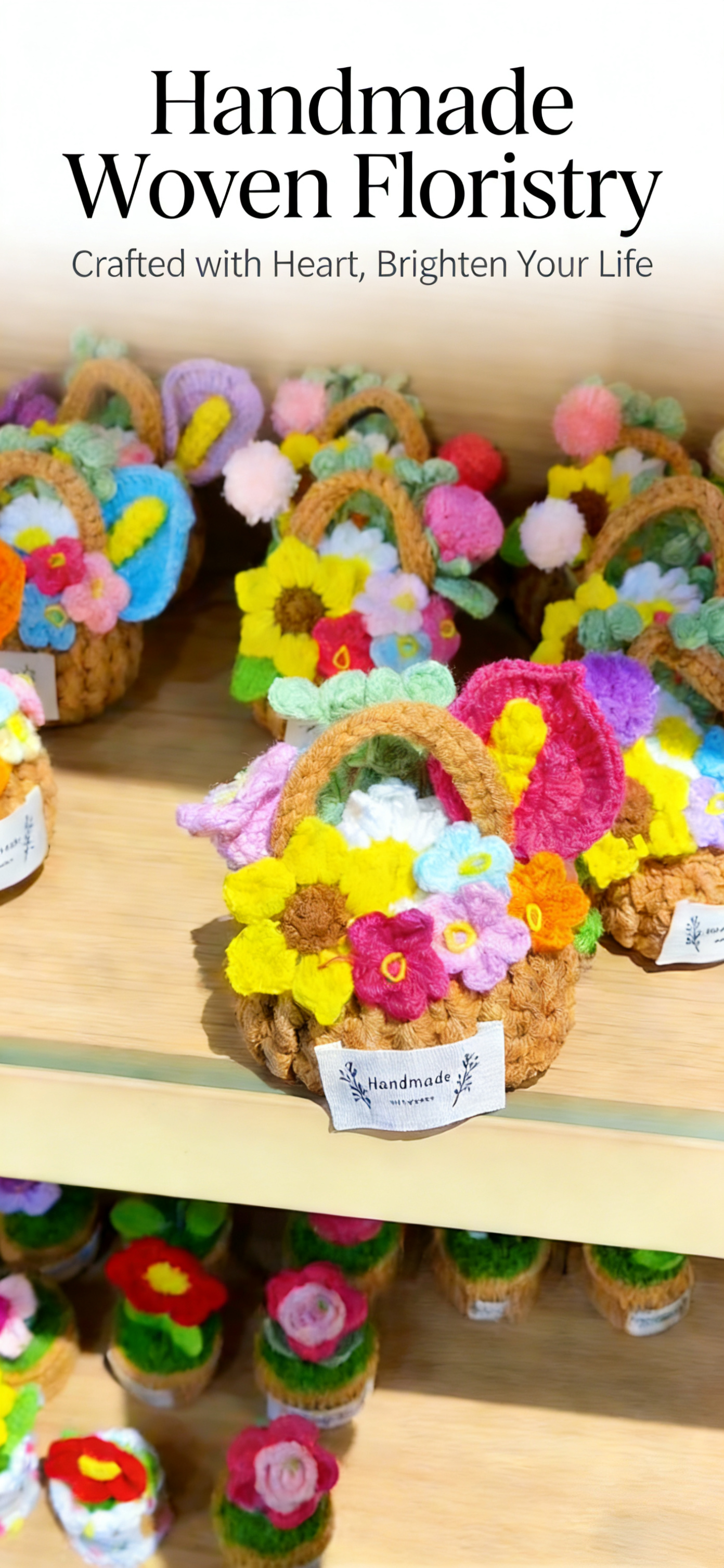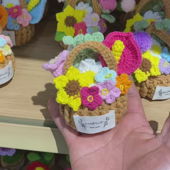 Each basket body and every flower (such as sunflower, eustoma, etc.) is individually crocheted by hand and then assembled. The stitches are full and delicate, without the repetitive feel of industrial production—each piece is a unique, adorable little item with the exclusive texture of handmade work.