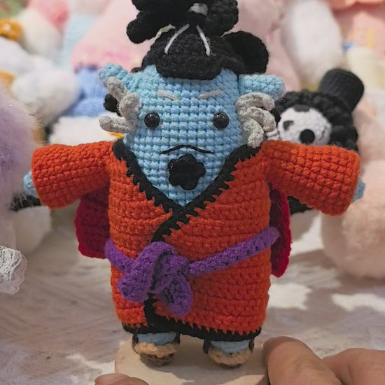 This handmade crocheted Jinbei doll faithfully replicates Jinbei's iconic look from One Piece: his signature blue skin, black curly hair paired with an orange kimono-style outfit, a purple belt at the waist, and a red cape, all details meticulously presented. The doll stands on a wooden base, giving it a strong sense of dimension. The handcrafted crochet technique gives the doll a soft texture and a unique handmade warmth, making it not only a perfect collectible for One Piece fans but also an exceptional choice for home decor or gifts, adding a touch of artisanal aesthetic to any anime merchandise collection.